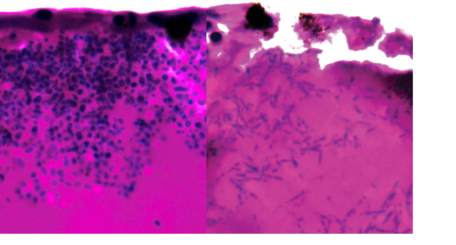 Candida auris during infection. Right hand image shows filaments